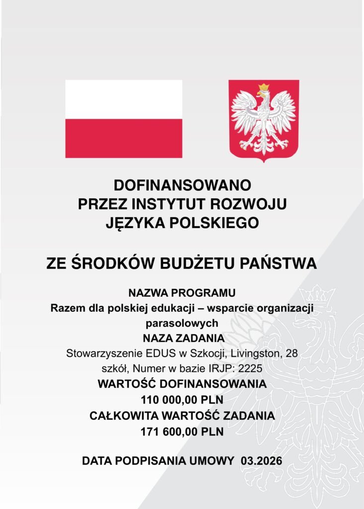 Dofinansowano przez Instytut Rozwoju Języka Polskiego ze środków budżetu państwa w ramach dotacji celowej na podstawie umowy o dofinansowanie z dnia 25.07..2025 w ramach wykonania zadania „Wsparcie bieżącej działalności organizacji parasolowej w Wielkiej Brytanii” .