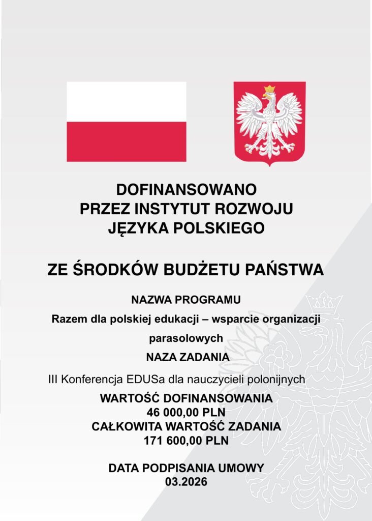 Informujemy, że nasza organizacja otrzymała za pośrednictwem Stowarzyszenia „Wspólnota Polska” dofinansowanie od Instytutu Rozwoju Języka Polskiego im. Św. Maksymiliana Marii Kolbego ze środków budżetu państwa w ramach konkursu „Razem dla polskiej edukacji – wsparcie organizacji parasolowych”.